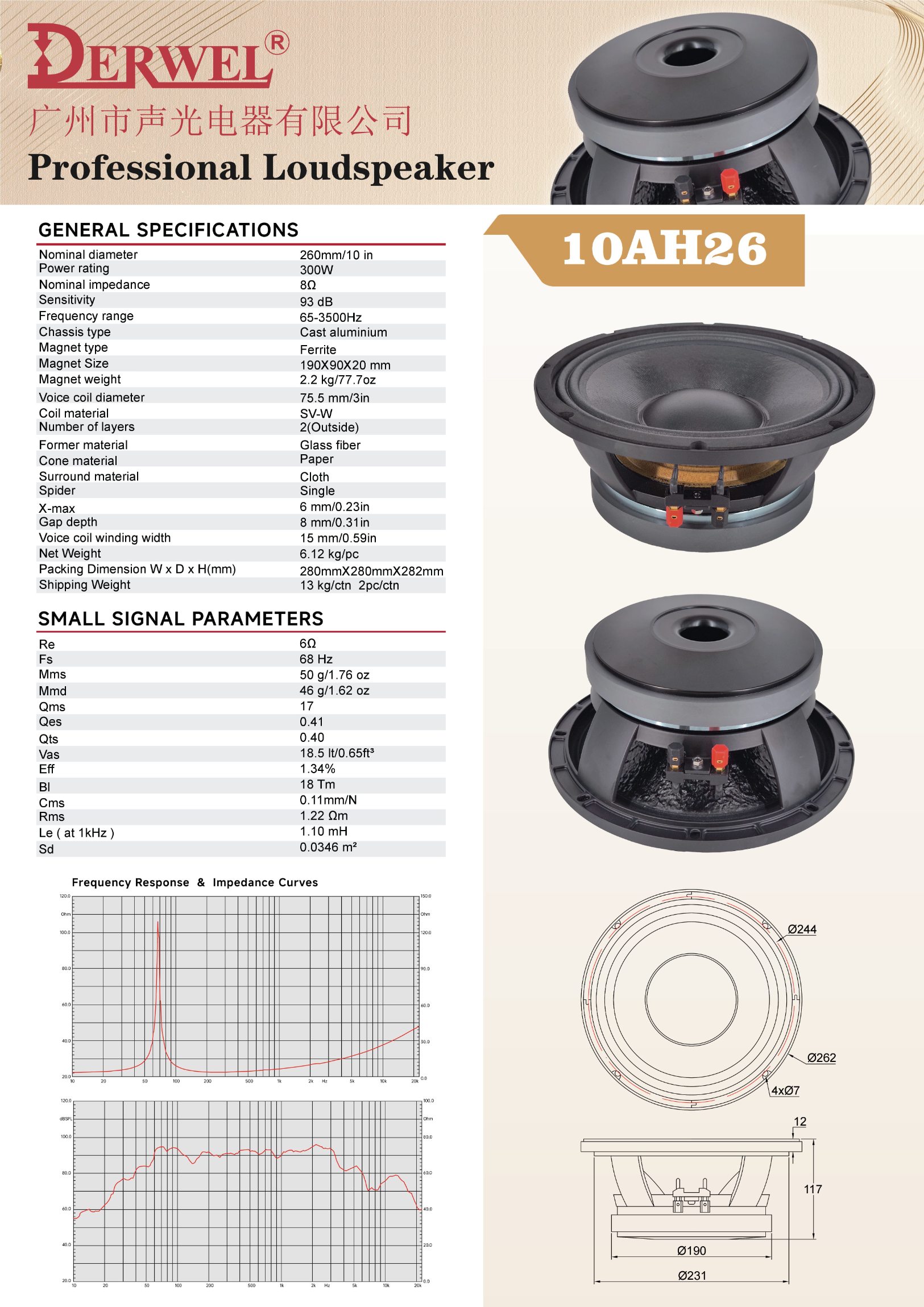DERWEL 10AH26 (10-inch pro loudspeaker): 300W, 8Ω, 53dB sensitivity, 65-3500Hz range. Sturdy build, ideal for pro audio setups.