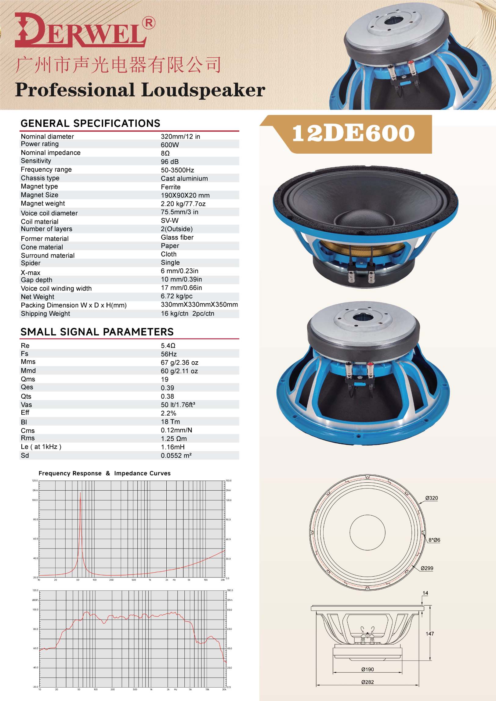 DERWEL 12DE600: 12-inch pro loudspeaker, 600W, 8Ω, 96dB sensitivity, 50-3500Hz. Sturdy, high-power for professional audio applications.