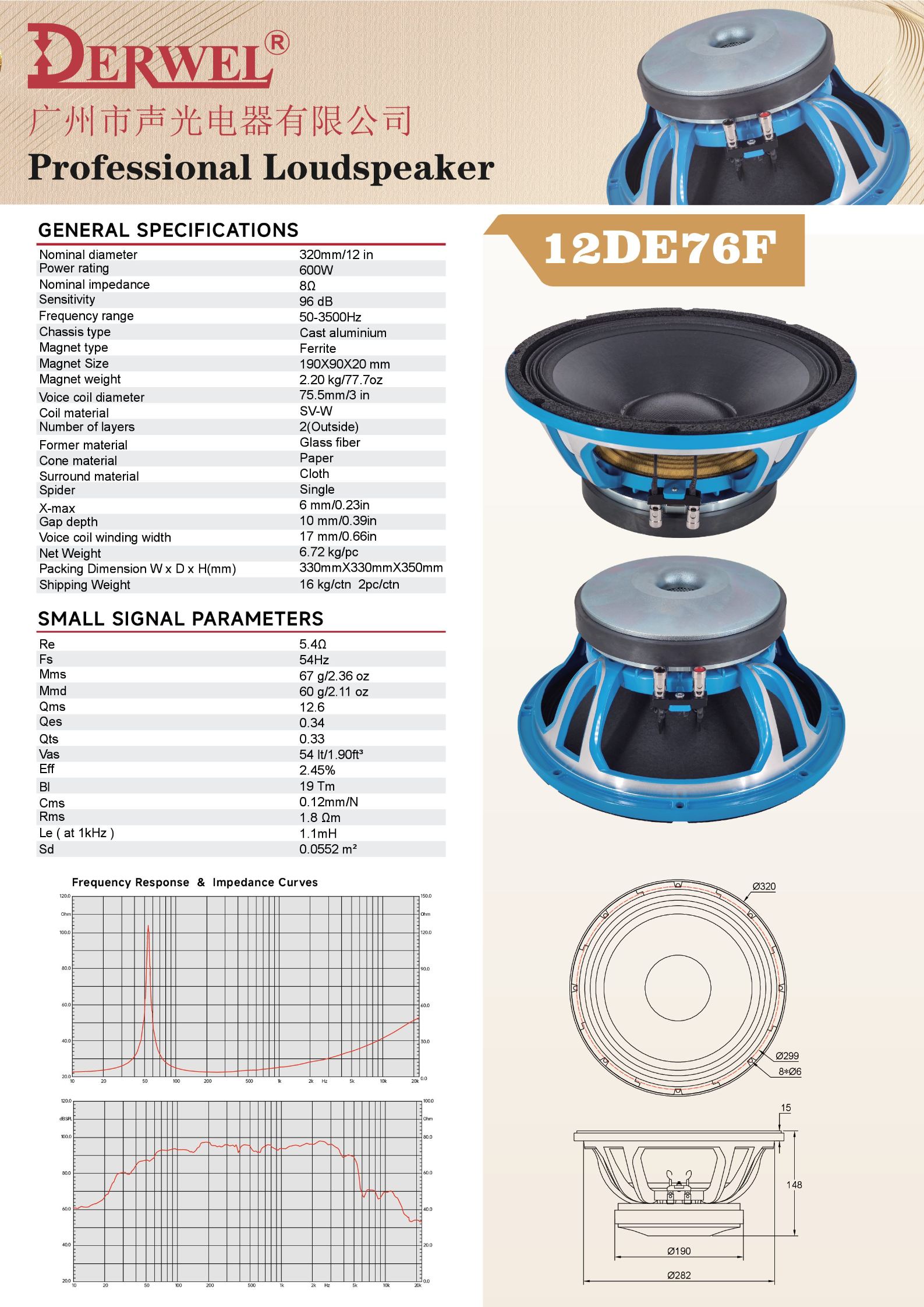 DERWEL 12DE76F: 12-inch pro loudspeaker, 600W, 8Ω, 96dB sensitivity, 50-3500Hz. Durable, high-power for pro audio setups.