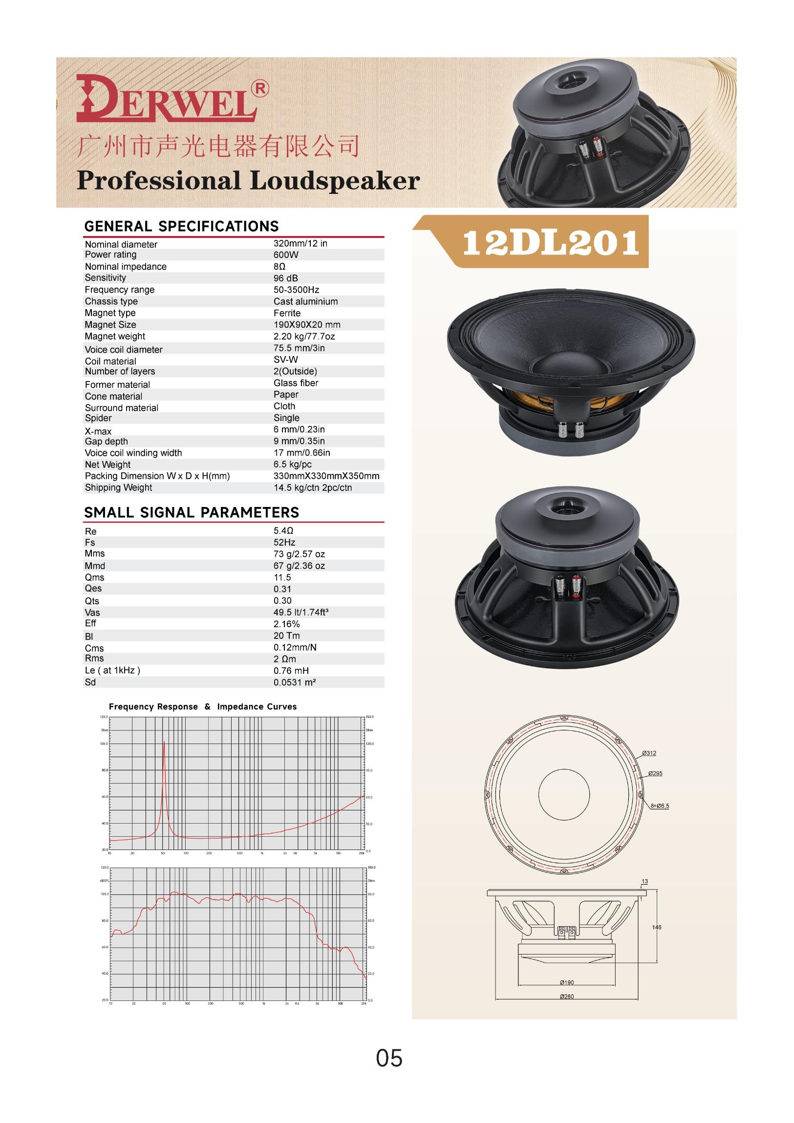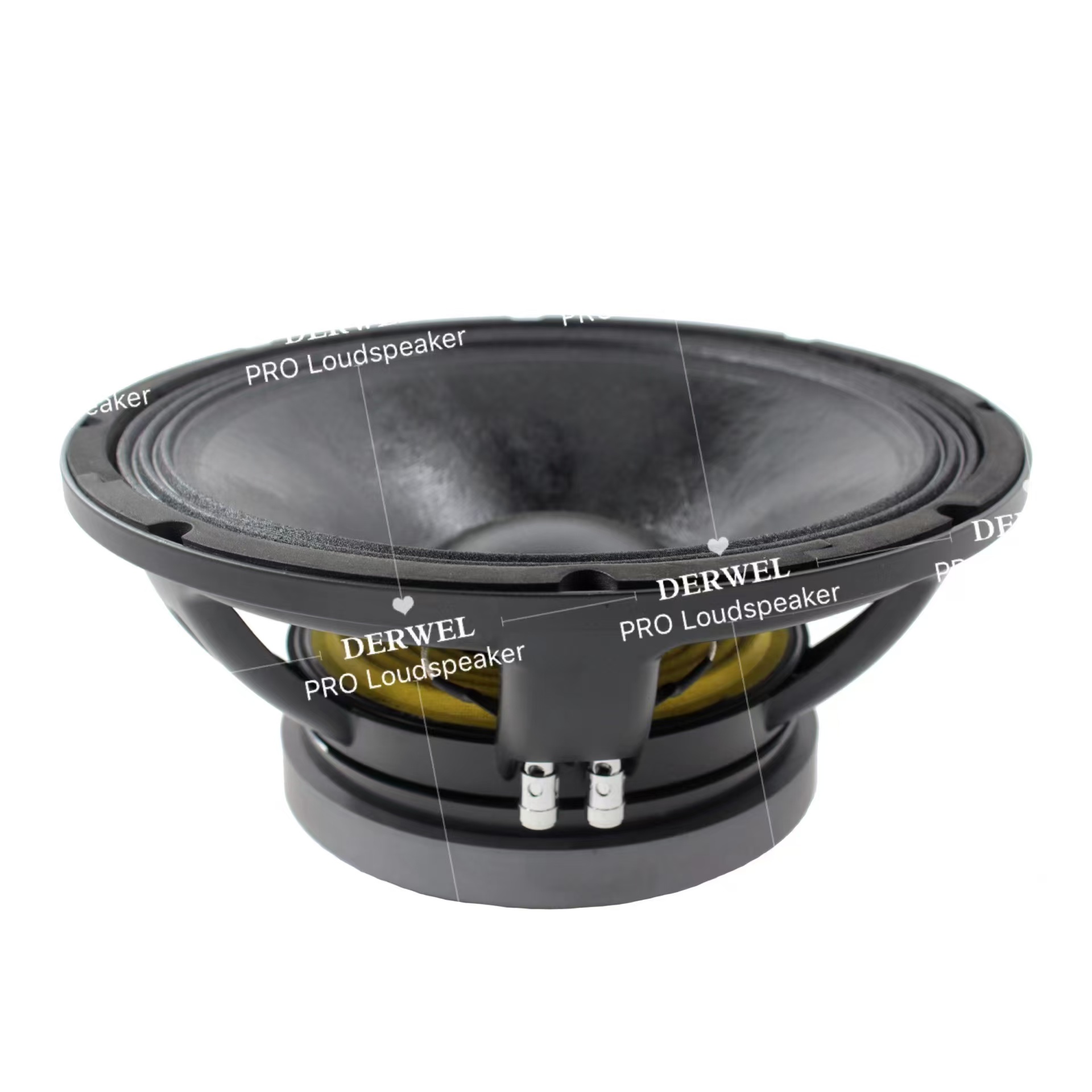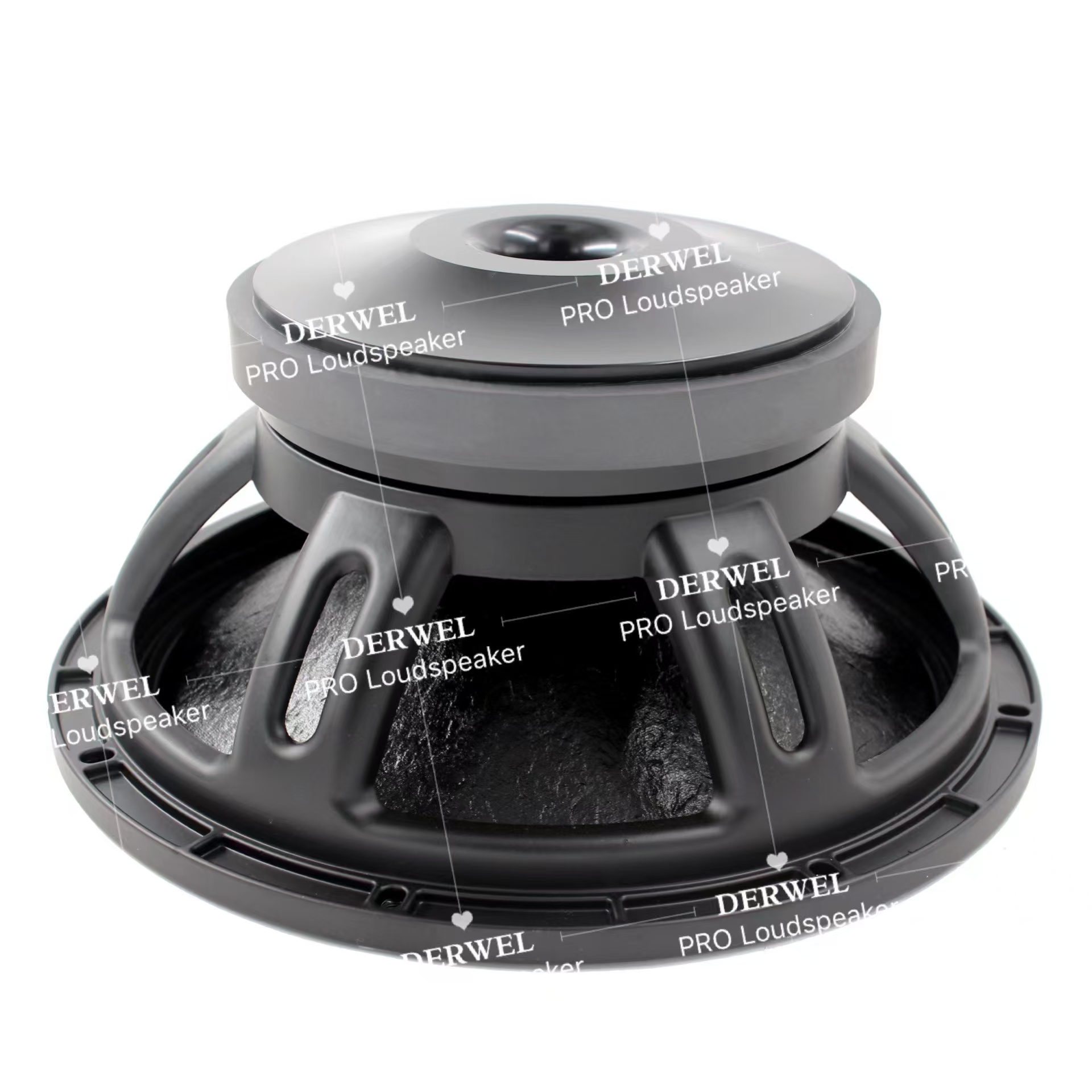 DERWEL 12DL201: 12-inch pro loudspeaker, 600W, 8Ω, 90dB sensitivity, 50-3500Hz. Sturdy build for professional audio use.