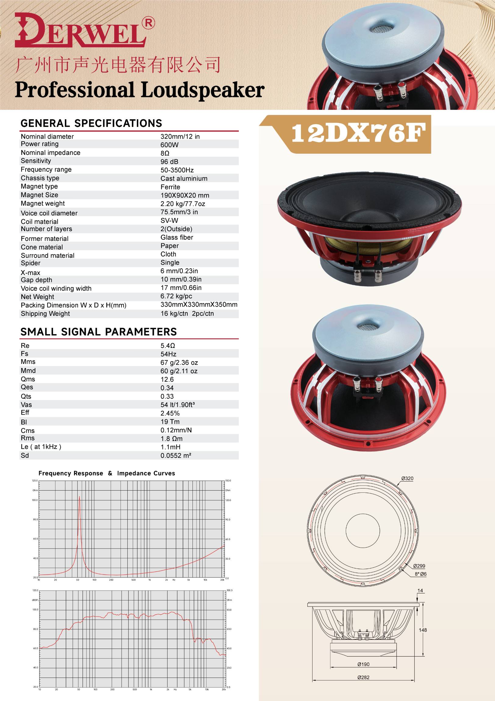 Derwel 12DX76F: 12-inch pro speaker, 600W, 8Ω, 96dB sensitivity, 90-3500Hz. Glass fiber former & paper cone for high-power mid-low frequency audio.