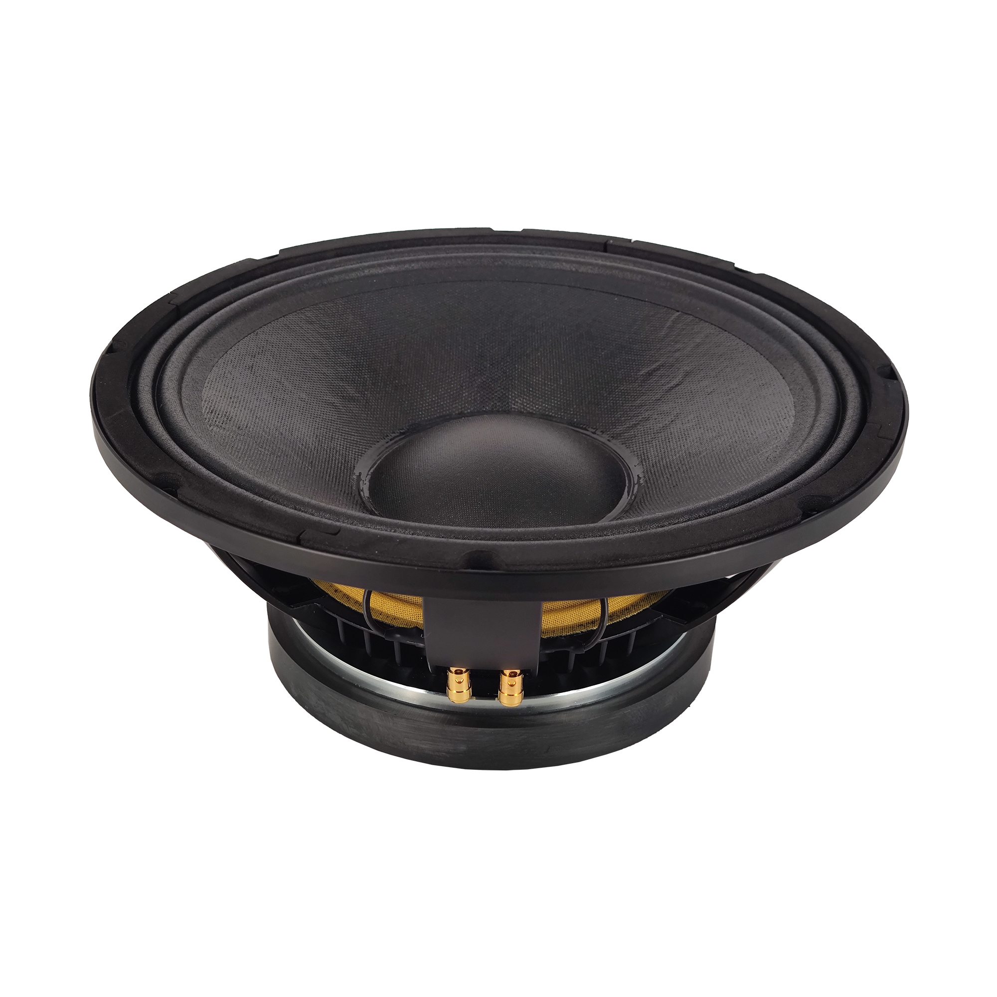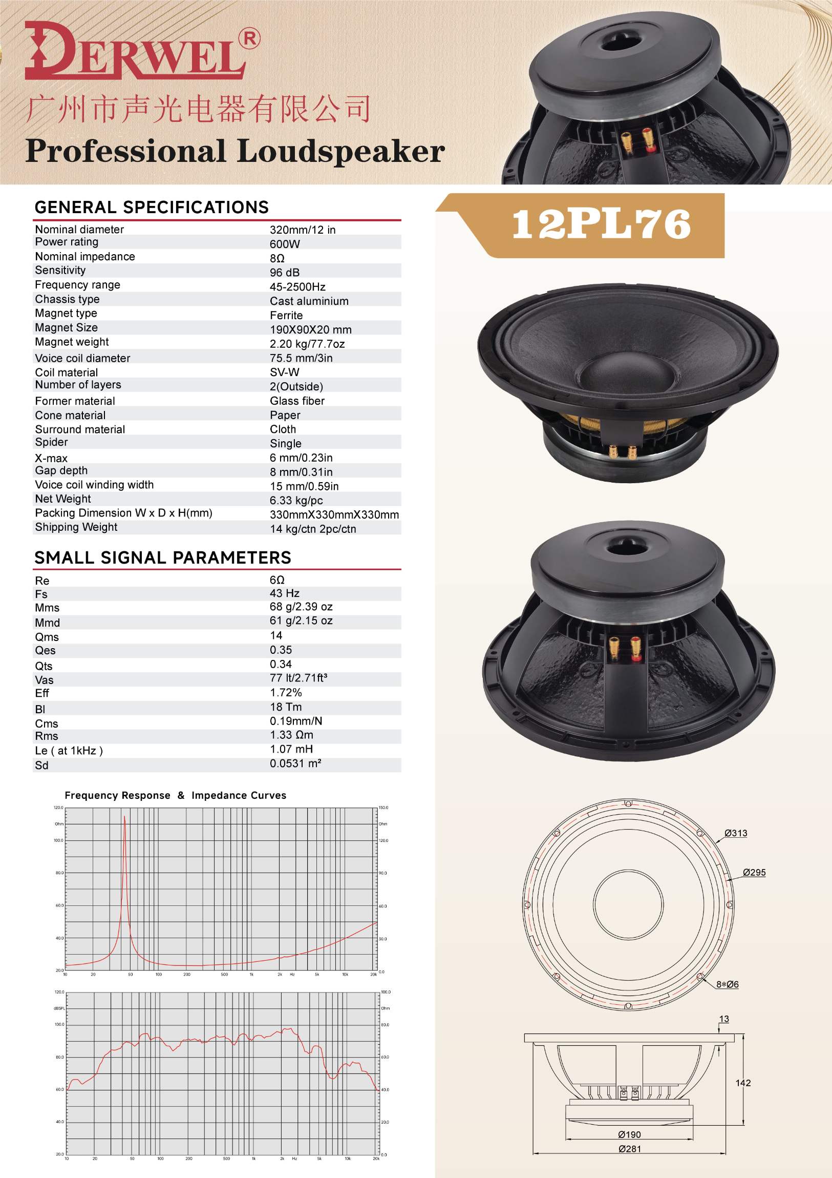 DERWEL 12PL76: 12-inch pro loudspeaker, 500W, 8Ω, 96dB sensitivity, 45-2500Hz. Sturdy design for professional audio applications.