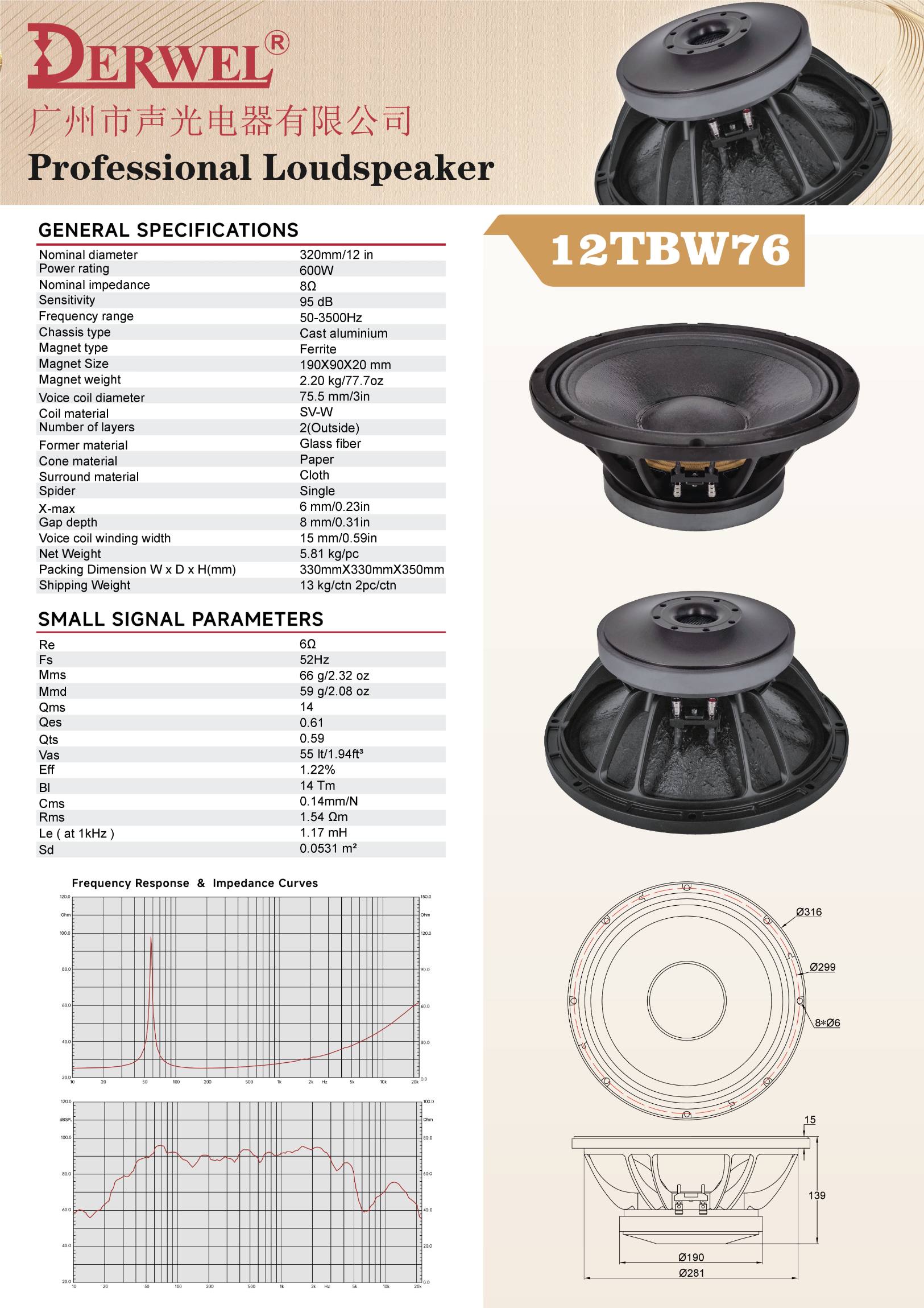 DERWEL 12TBW76: 12-inch pro loudspeaker, 600W, 8Ω, 95dB sensitivity, 50-3500Hz. Durable, suitable for professional audio setups.