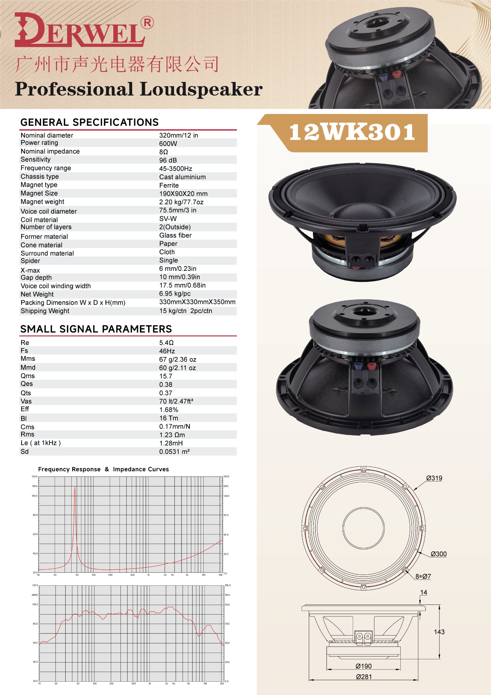 DERWEL 12WK301: 12-inch pro loudspeaker, 600W, 8Ω, 96dB sensitivity, 45-3500Hz. Robust build for professional audio applications.