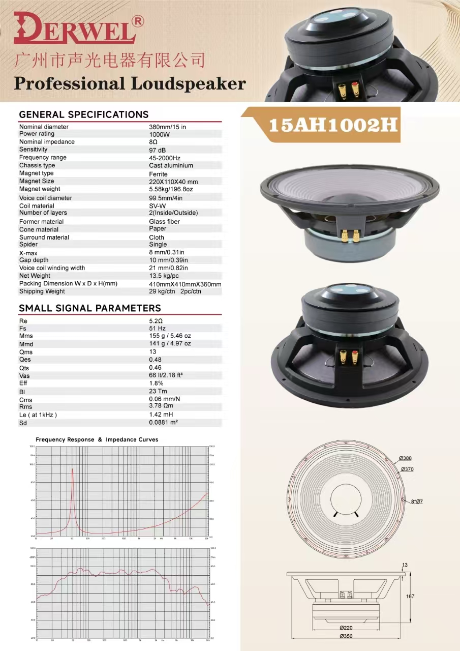 DERWEL 15AH1002H: 15-inch pro loudspeaker, 1000W, 8Ω, 97dB sensitivity, 45-2000Hz. High-power, robust for pro audio use.