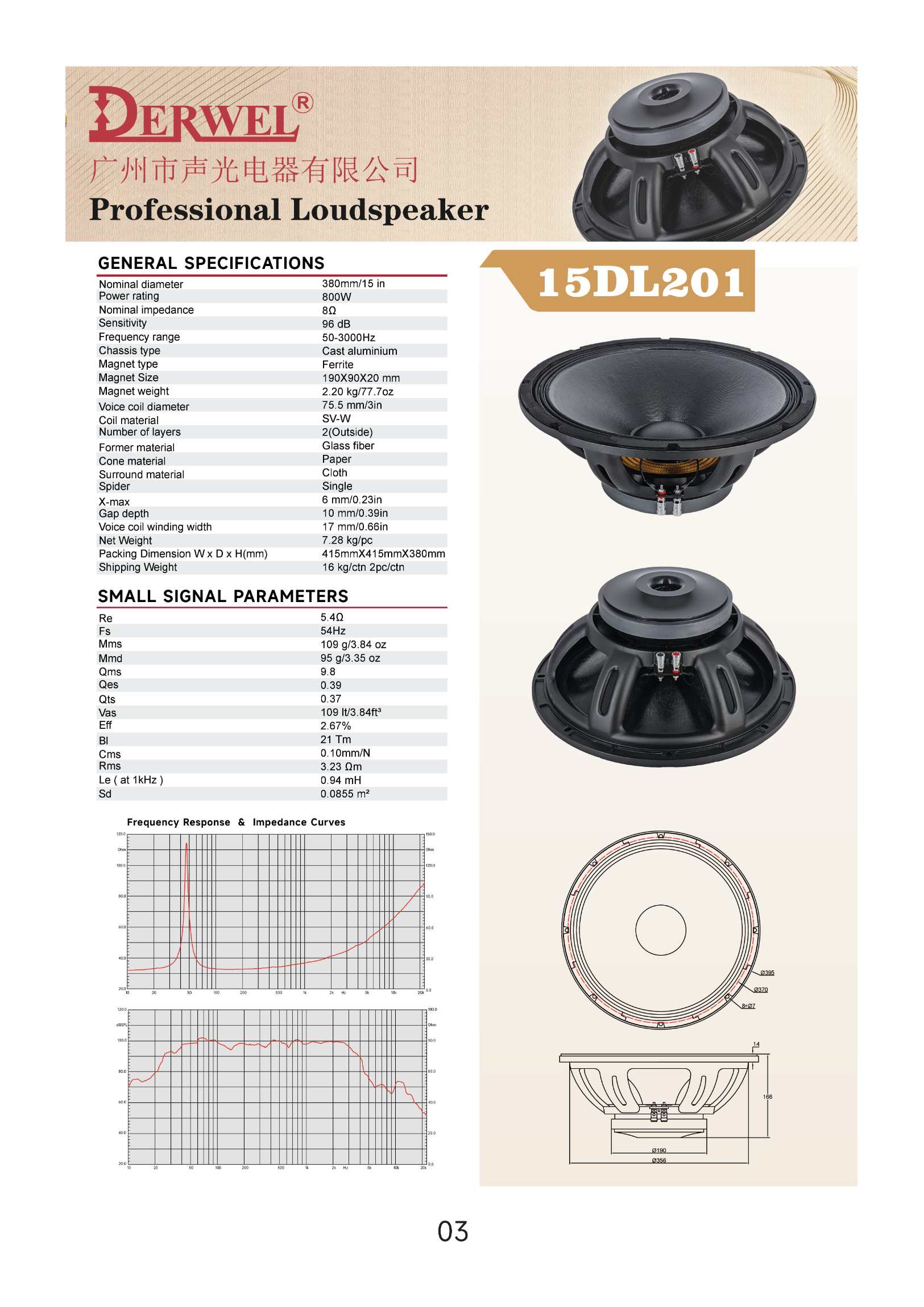 DERWEL 15DL201: 15-inch pro loudspeaker, 800W, 8Ω, 90dB sensitivity, 50-3000Hz. Sturdy build for professional audio applications.