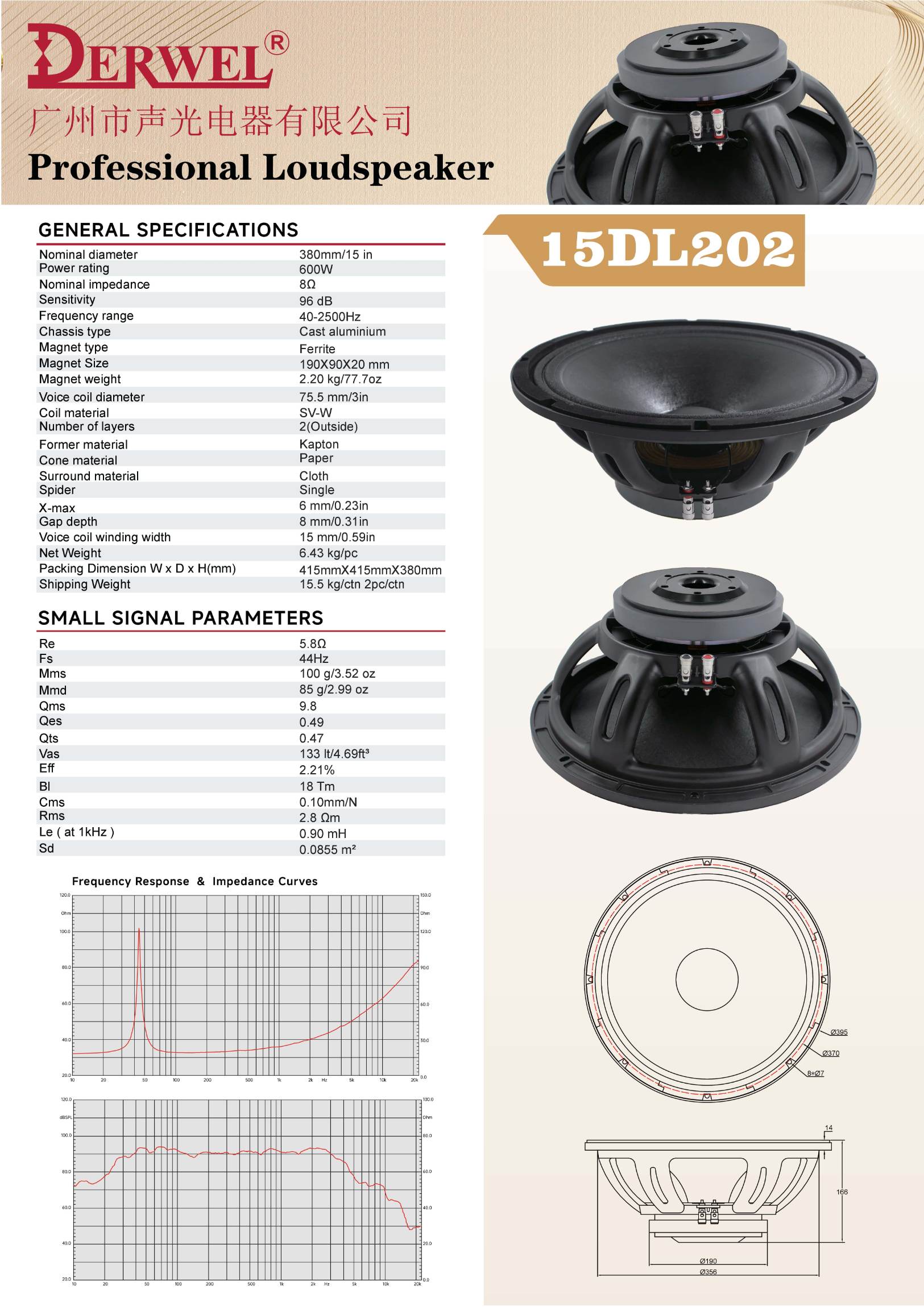 Derwel 15DL202: 15-inch pro speaker, 600W, 8Ω, 96dB sensitivity, 40-2500Hz. Kapton former & paper cone for powerful low-mid frequency audio.