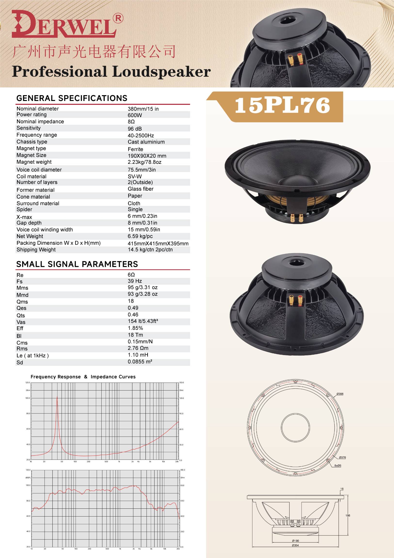 DERWEL 15PL76: 15-inch pro loudspeaker, 800W, 8Ω, 96dB sensitivity, 40-2500Hz. Sturdy, high-power for professional audio applications.