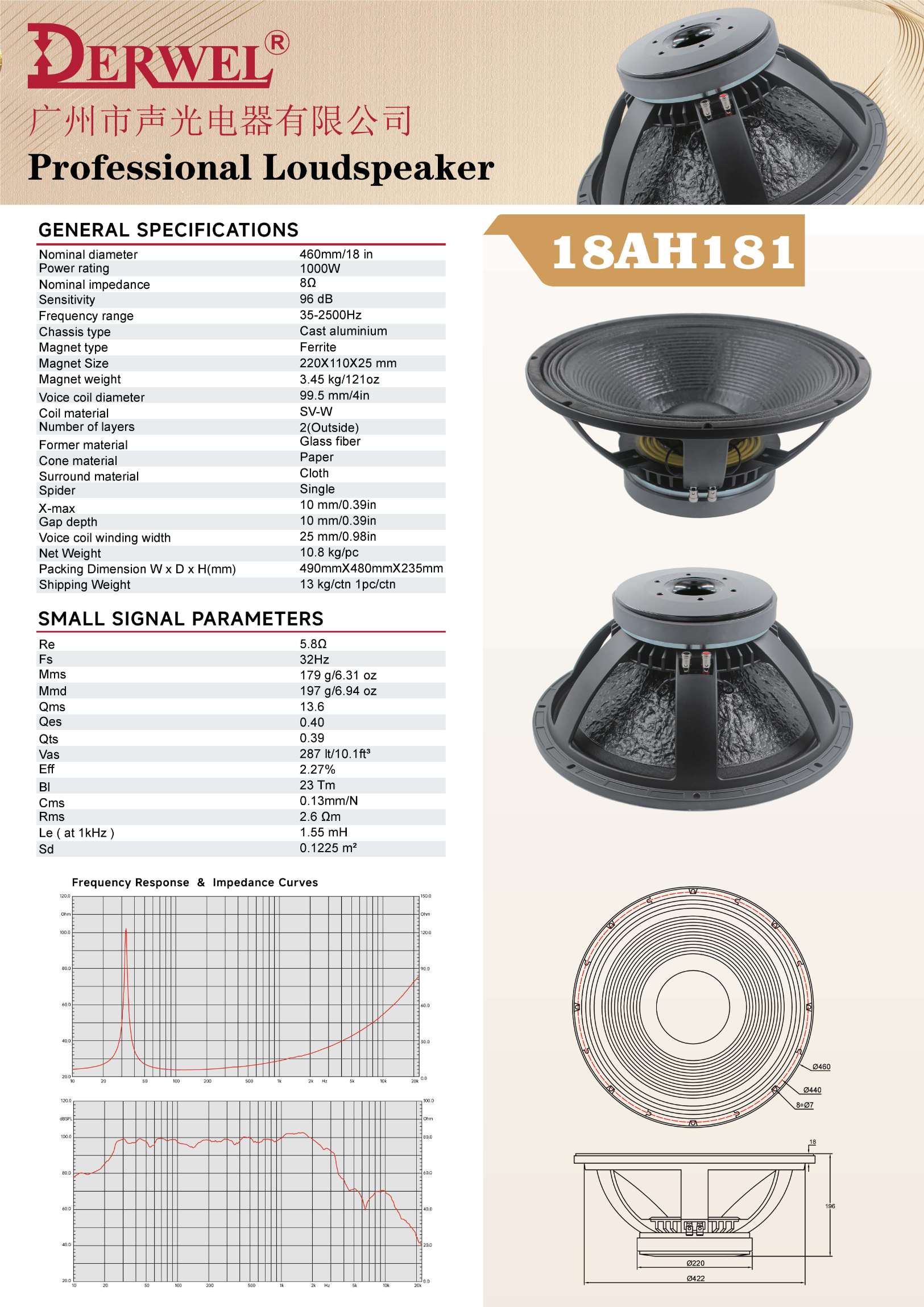 DERWEL 18AH181: 18-inch pro loudspeaker, 1000W, 8Ω, 96dB sensitivity, 35-2500Hz. High-power, robust for professional audio setups.