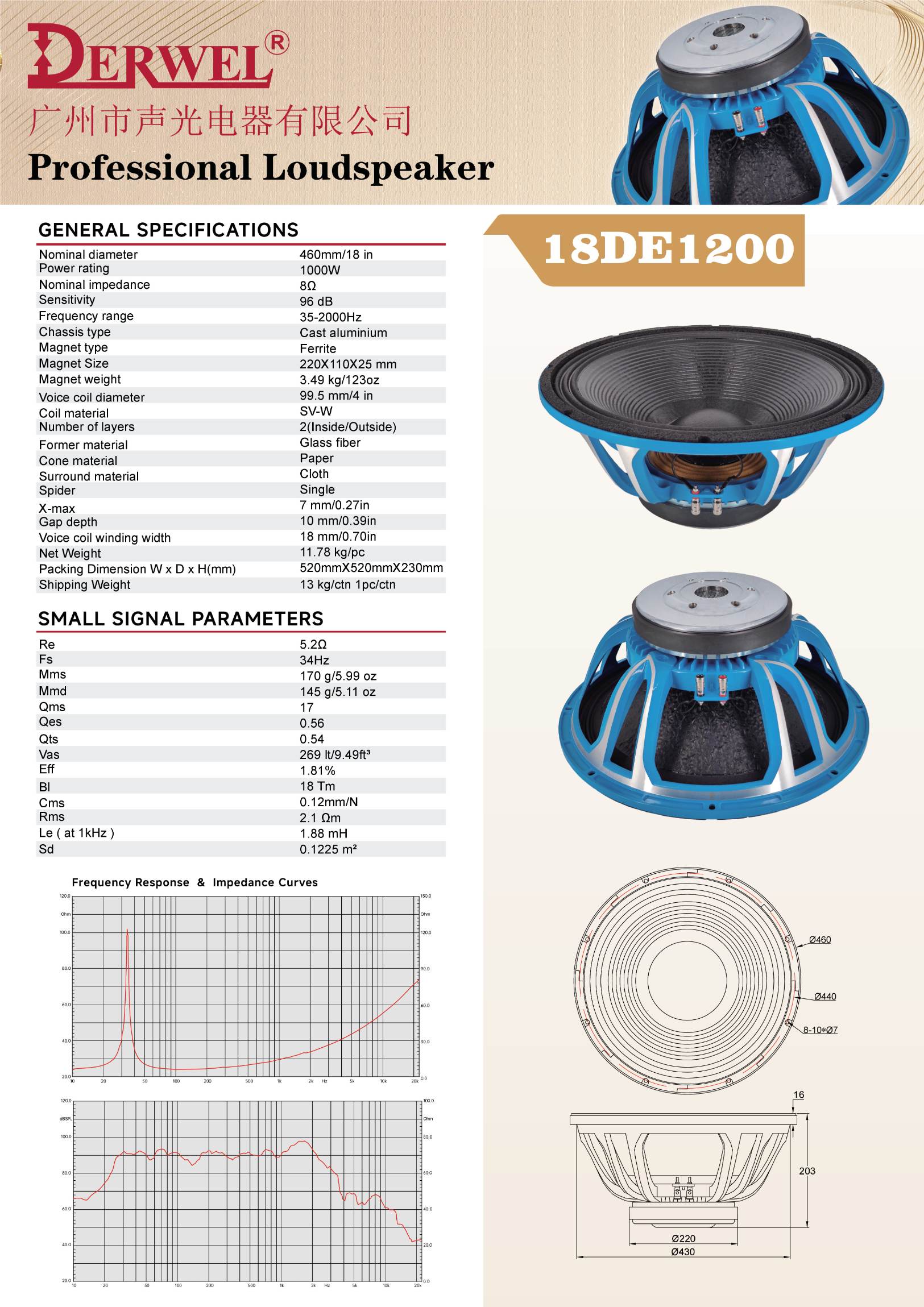 DERWEL 18DE1200: 18-inch pro loudspeaker, 1000W, 8Ω, 96dB sensitivity, 50-2000Hz. High-power, durable for professional audio applications.