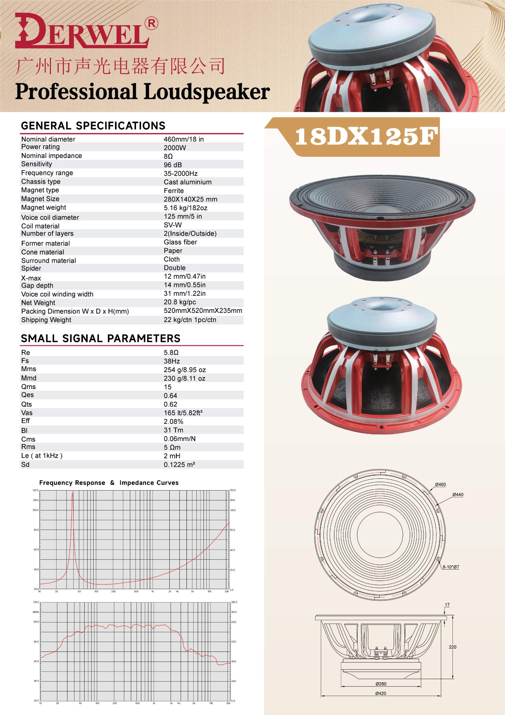 Derwel 18DX125F: 18-inch pro speaker, 2000W, 8Ω, 96dB sensitivity, 35-2000Hz. Glass fiber former & paper cone for high-power low-mid frequency audio.