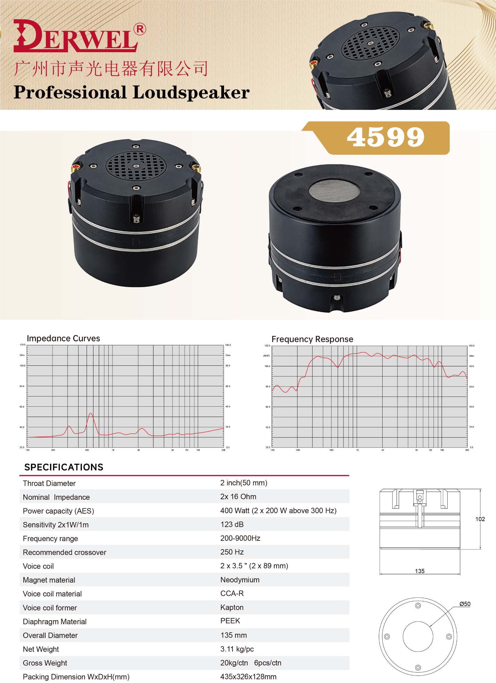 Derwel 4599: 2-inch pro compression driver, 2×16Ω, 400W, 123dB sensitivity, 200-9000Hz. Neodymium magnet & CCA-R coil for high-performance mid-high frequency audio.