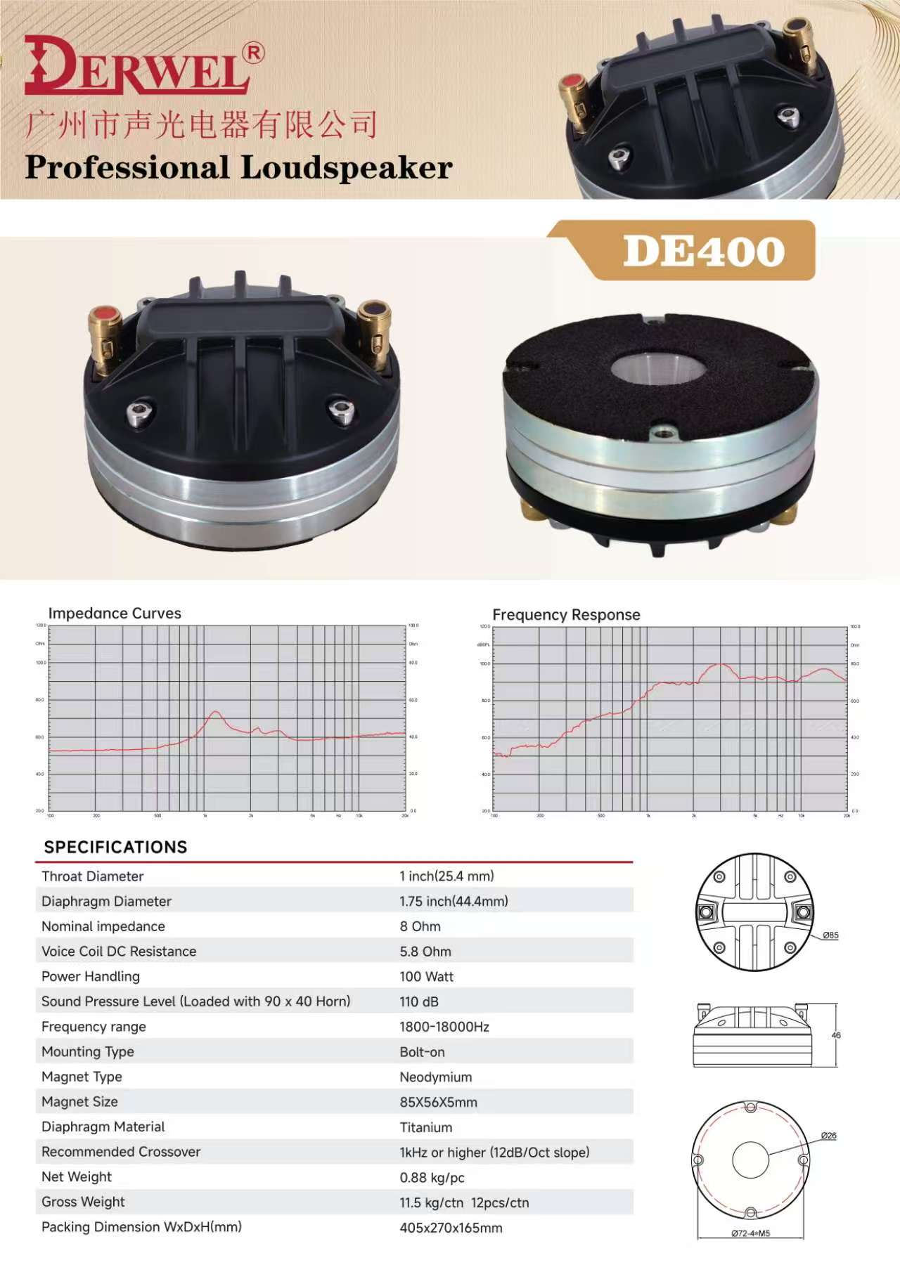 Derwel DE400: 1-inch HF driver, 8Ω, 100W, 110dB sensitivity, 1800-18000Hz. Neodymium magnet & titanium diaphragm for high-efficiency high-frequency audio.