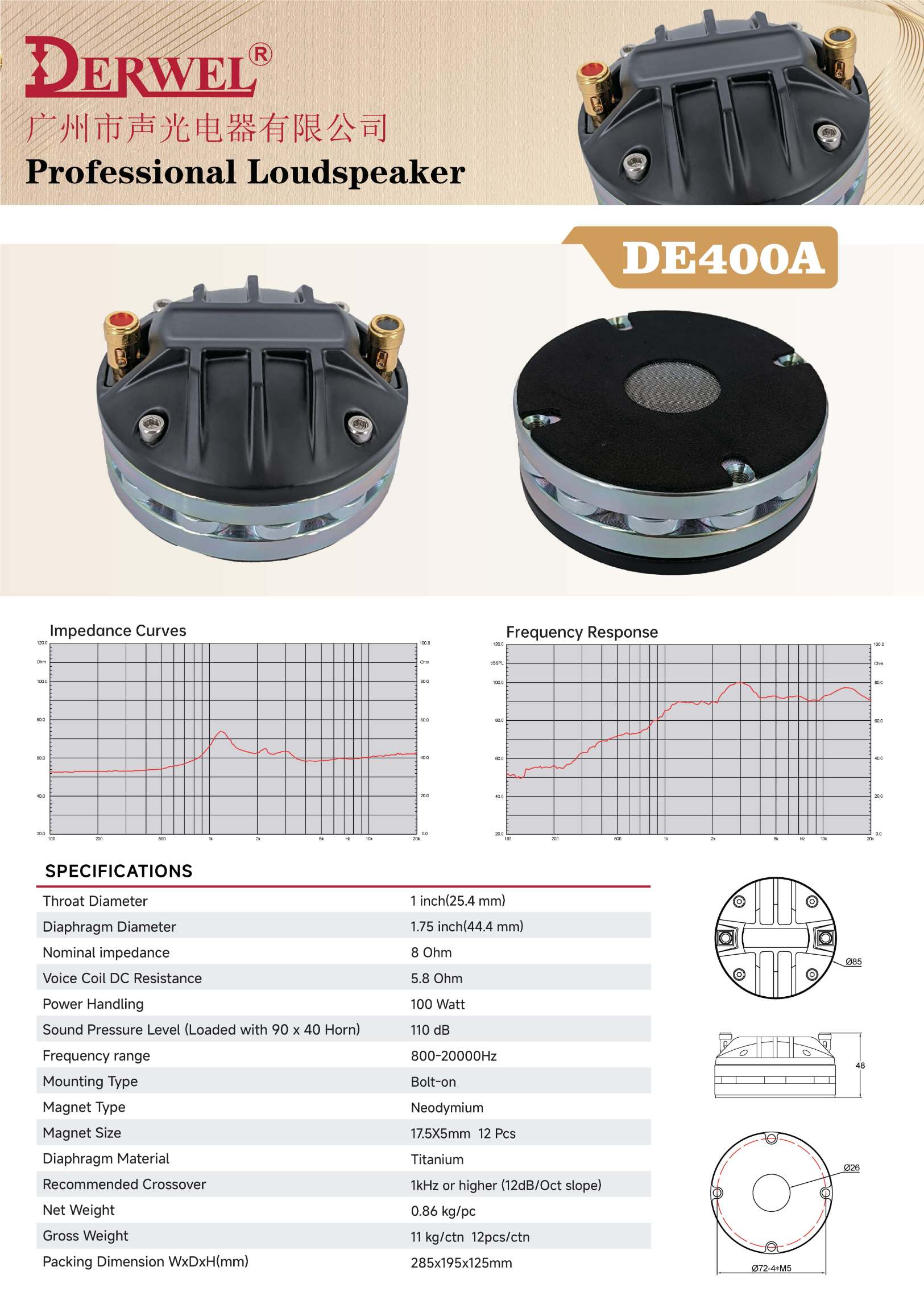 Derwel DE400A: 1.75-inch HF driver, 100W, 8Ω, 110dB sensitivity, 800-20000Hz. Titanium diaphragm & neodymium magnet for clear high frequencies.