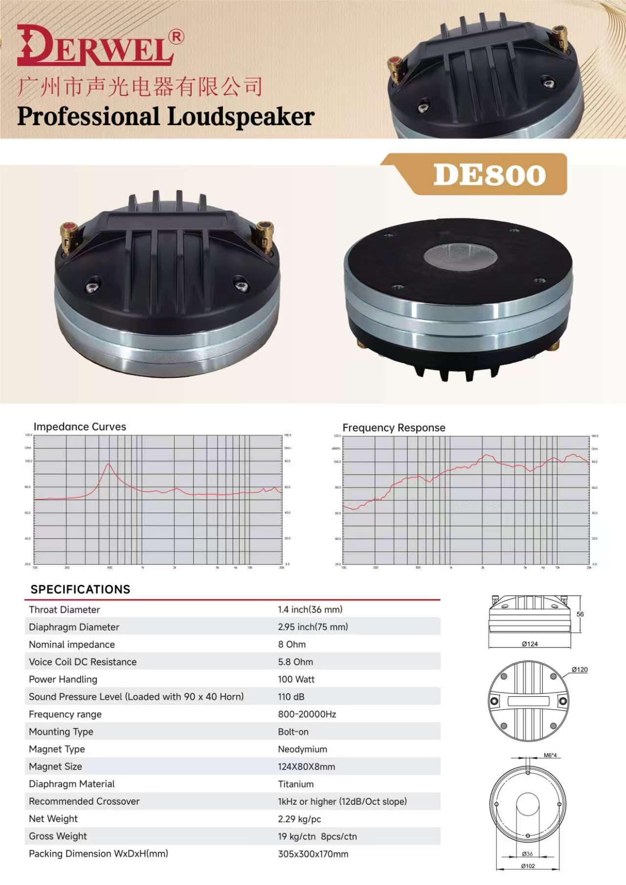 Derwel DE800: 1.4-inch HF driver, 8Ω, 100W, 110dB sensitivity, 800-20000Hz. Neodymium magnet & titanium diaphragm for wide-range high-frequency audio.