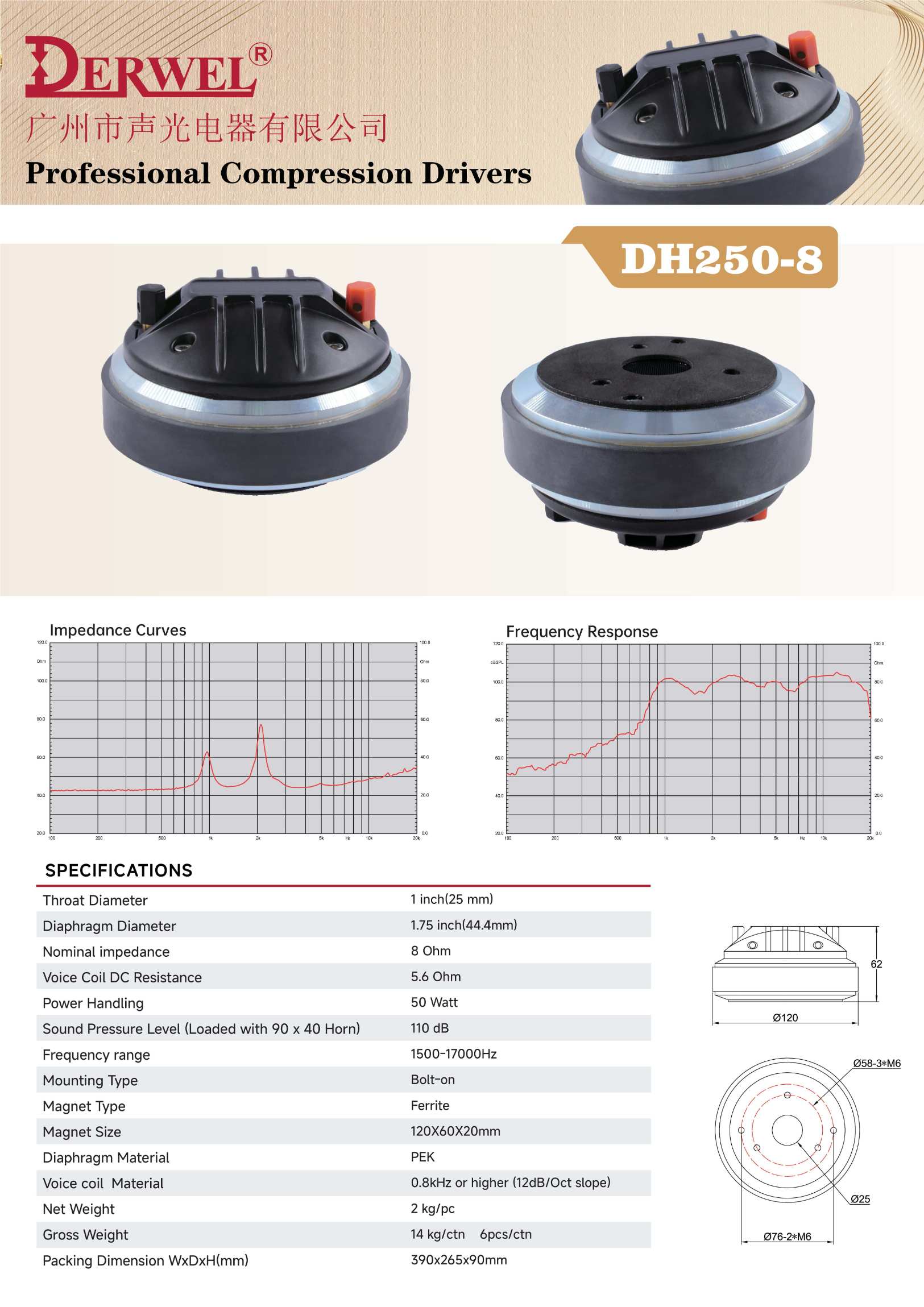 Derwel DH250-8: 1.75-inch compression driver, 50W, 8Ω, 110dB sensitivity, 1500-17000Hz. PE diaphragm for high-frequency clarity.