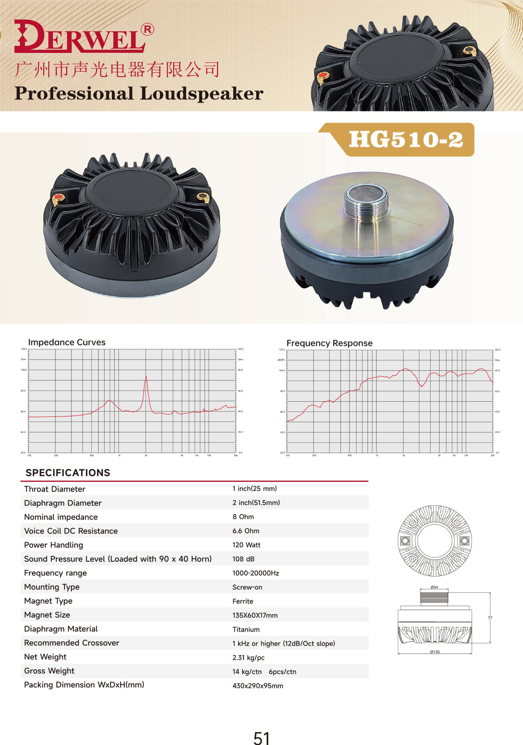 Derwel HG510-2: 1-inch HF driver, 8Ω, 120W, 108dB sensitivity, 1000-20000Hz. Ferrite magnet & titanium diaphragm for high-power high-frequency audio.