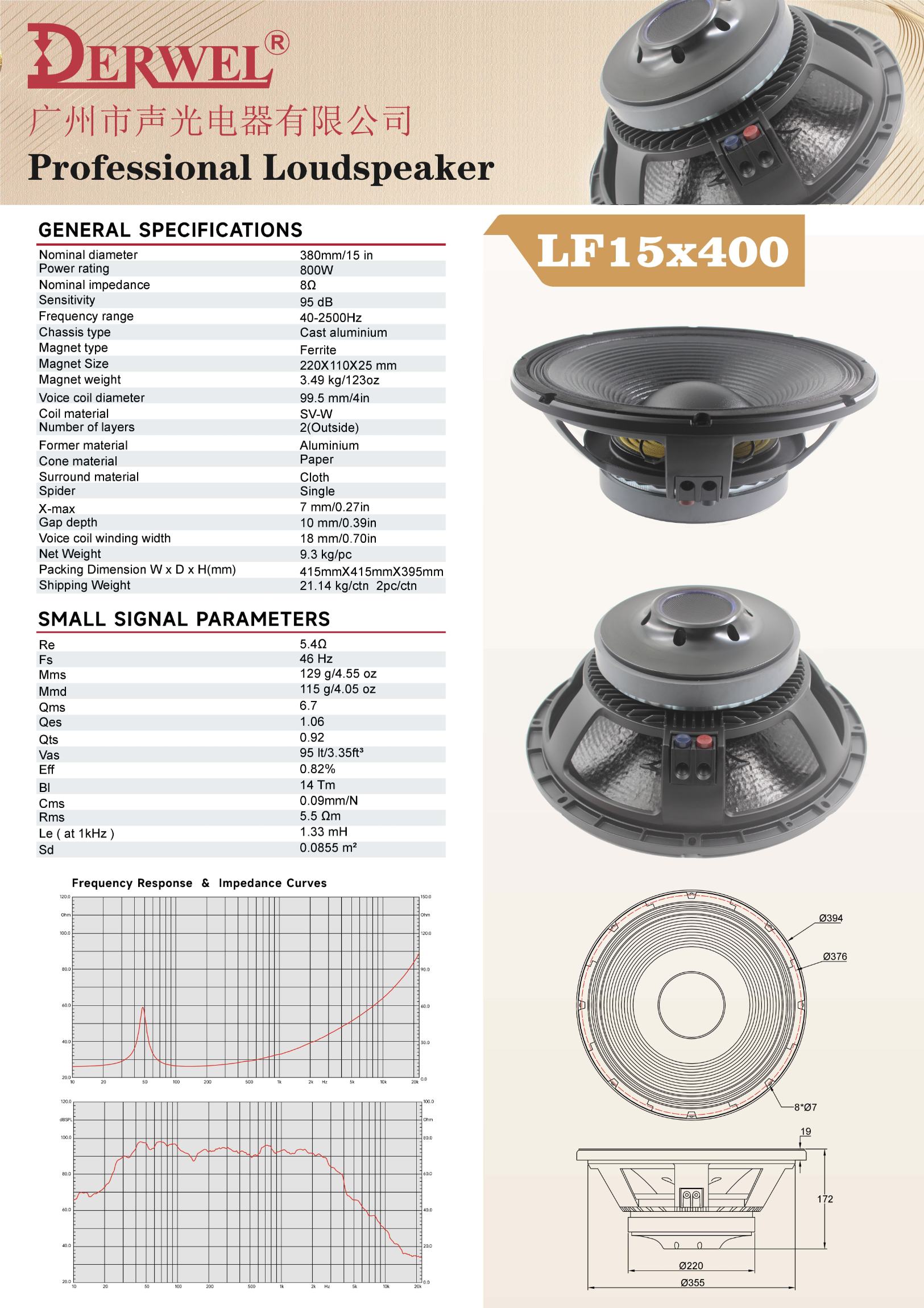 DERWEL LF15x400: 15-inch pro loudspeaker, 800W, 8Ω, 95dB sensitivity, 50-2500Hz. High-power, durable for professional audio setups.