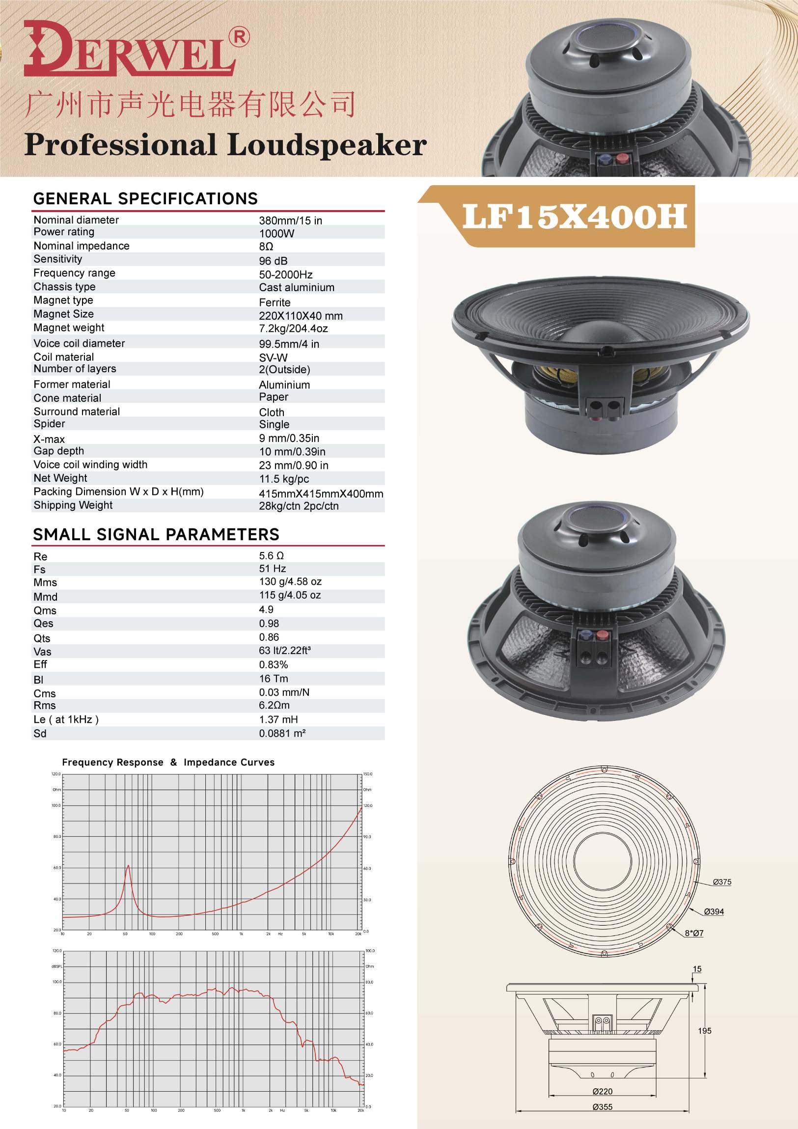 DERWEL LF15X400H: 15-inch pro loudspeaker, 1000W, 8Ω, 96dB sensitivity, 50-2000Hz. High-power, robust for professional audio use.