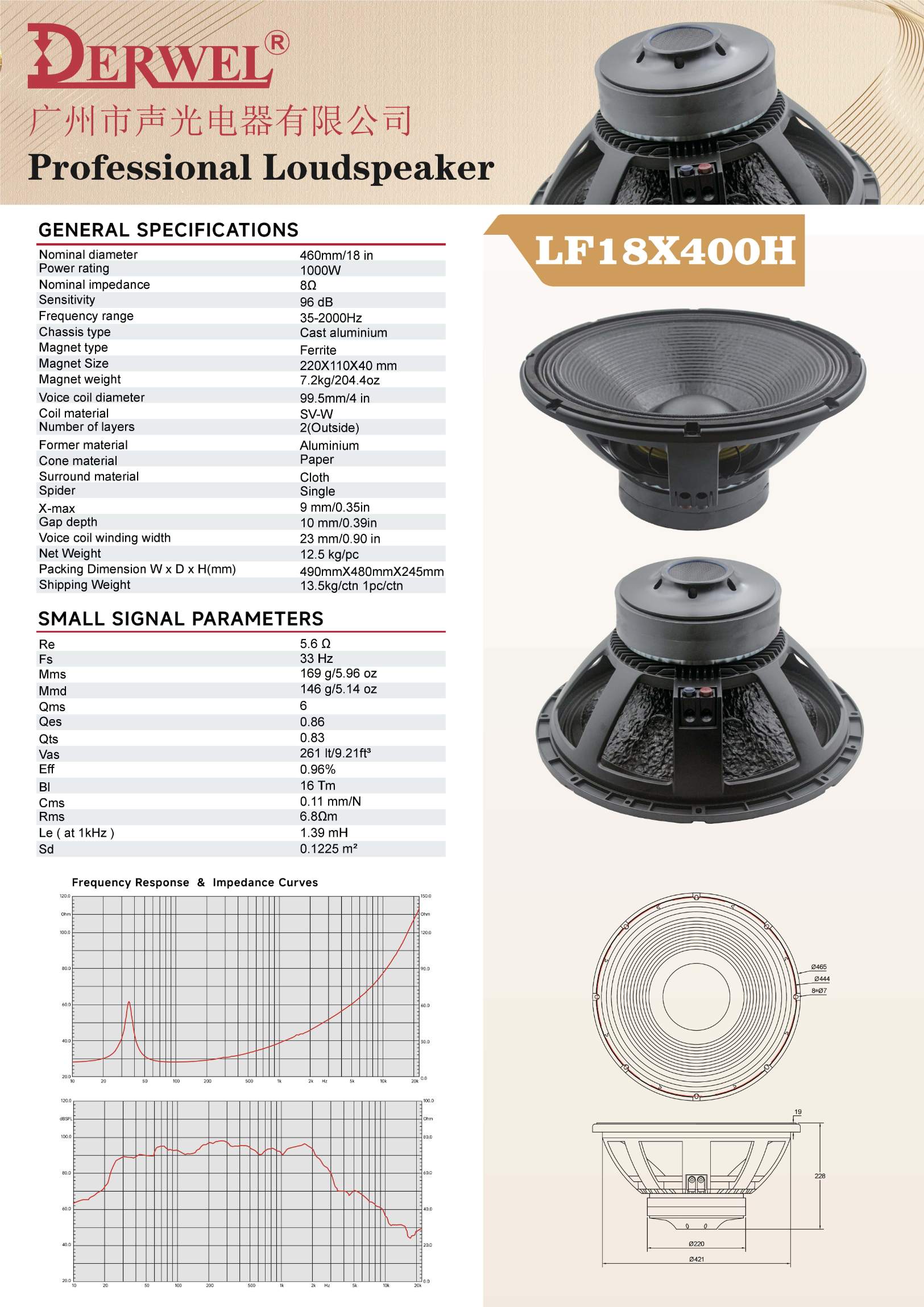 DERWEL LF18X400H: 18-inch pro loudspeaker, 1000W, 8Ω, 96dB sensitivity, 35-2000Hz. Aluminum-former design for durable, high-performance professional audio.