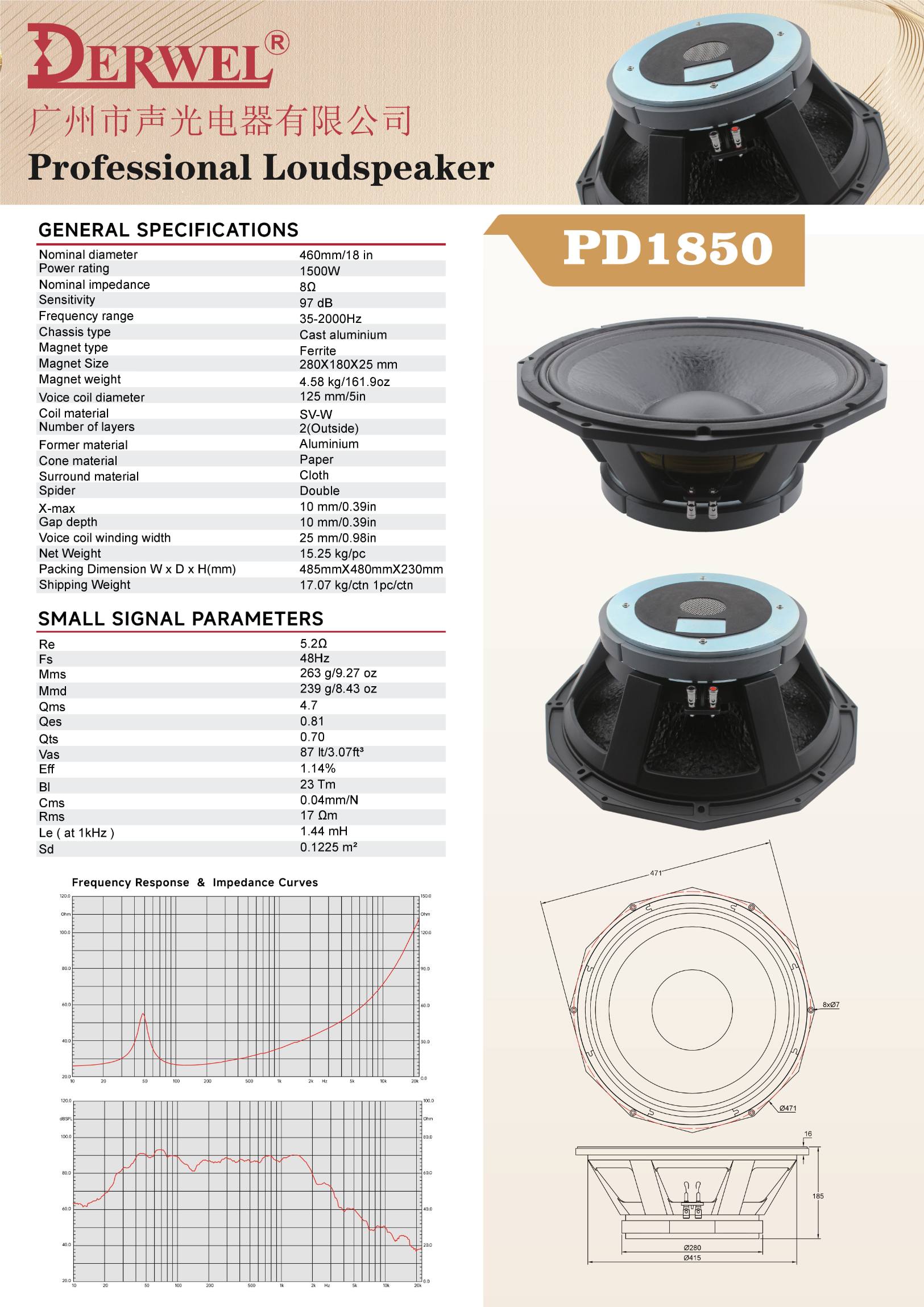 DERWEL PD1850: 18-inch pro loudspeaker, 1500W, 8Ω, 97dB sensitivity, 35-2000Hz. Aluminum-former design for high-power, efficient professional audio.