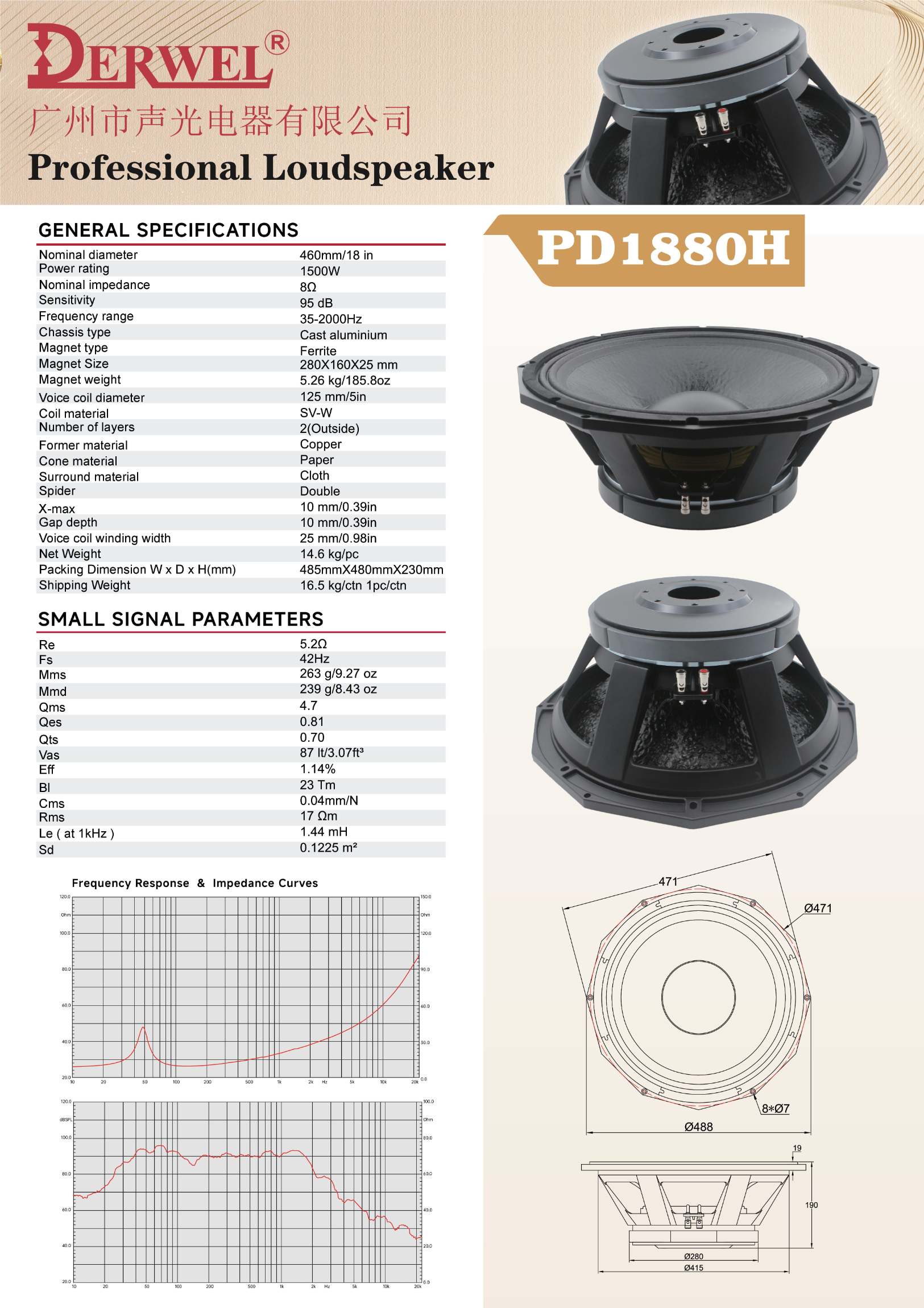 DERWEL PD1880H: 18-inch pro loudspeaker, 1500W, 8Ω, 97dB sensitivity, 35-2000Hz. Copper-former design for high-power, stable professional audio performance.