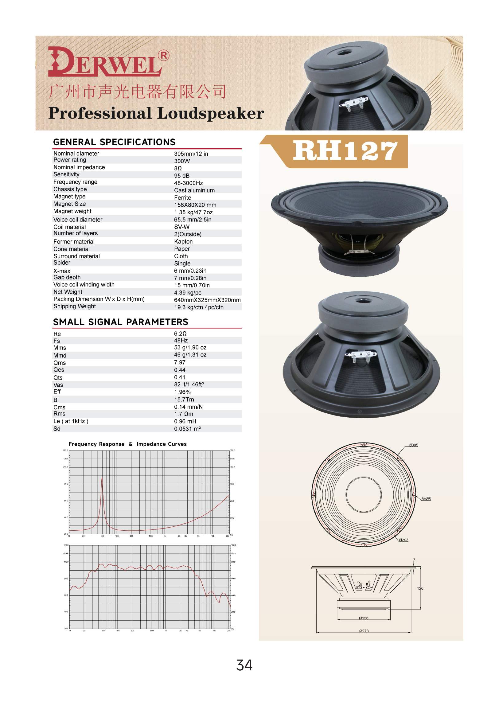 DERWEL RH127: 12-inch pro loudspeaker, 300W, 8Ω, 98dB sensitivity, 48-3000Hz. High-sensitivity, suitable for pro audio setups.